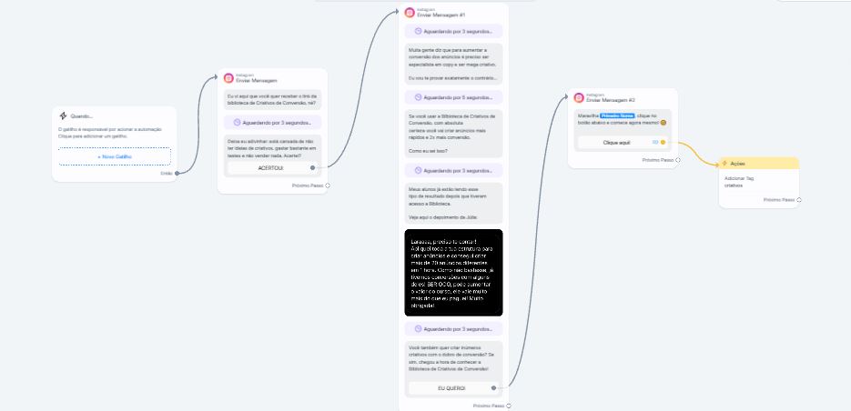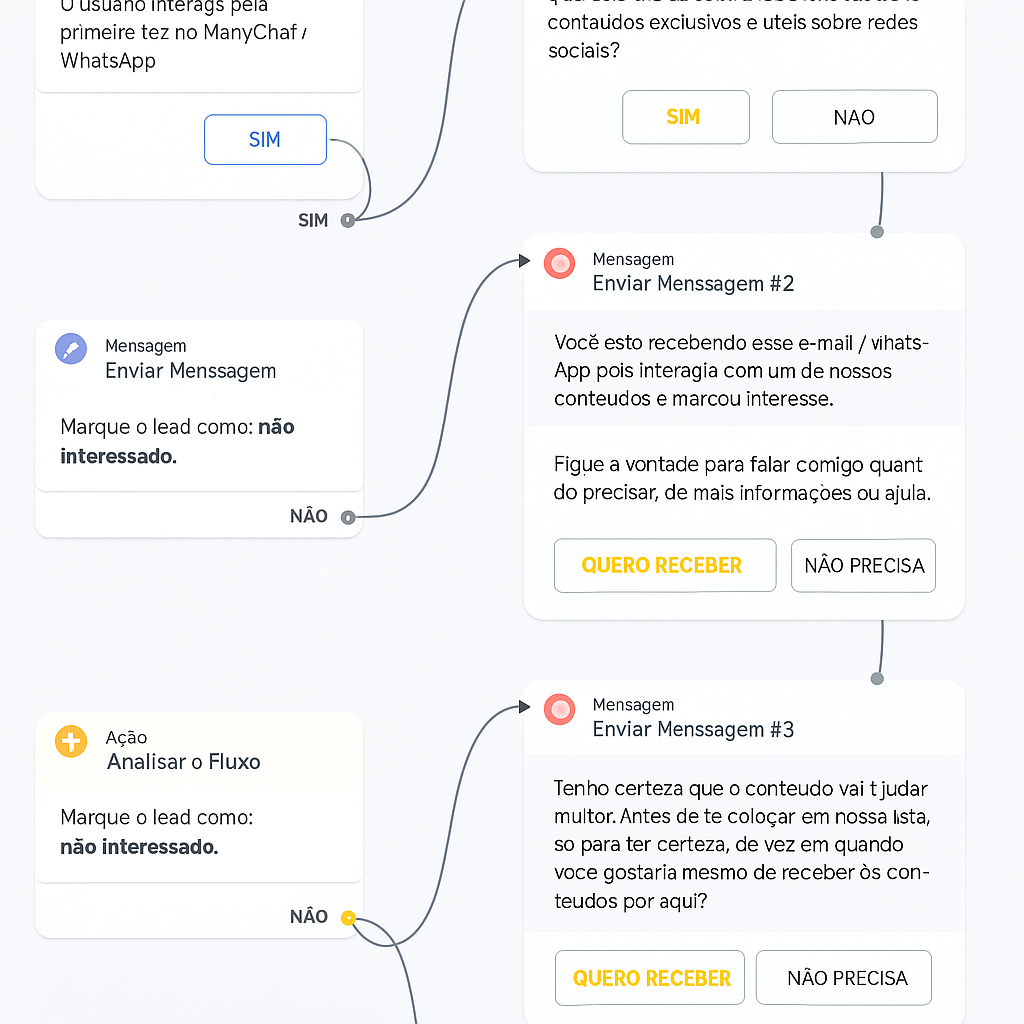 Criação de jornadas automatizadas no WhatsApp, ManyChat, e-mail e site, que respondem rápido, filtram o público certo e direcionam para o próximo passo.