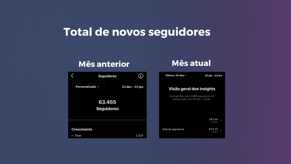 Acompanhamos métricas reais, como:  alcance, engajamento, crescimento e conversão e transformamos esses dados em decisões estratégicas para melhorar os resultados mês a mês.